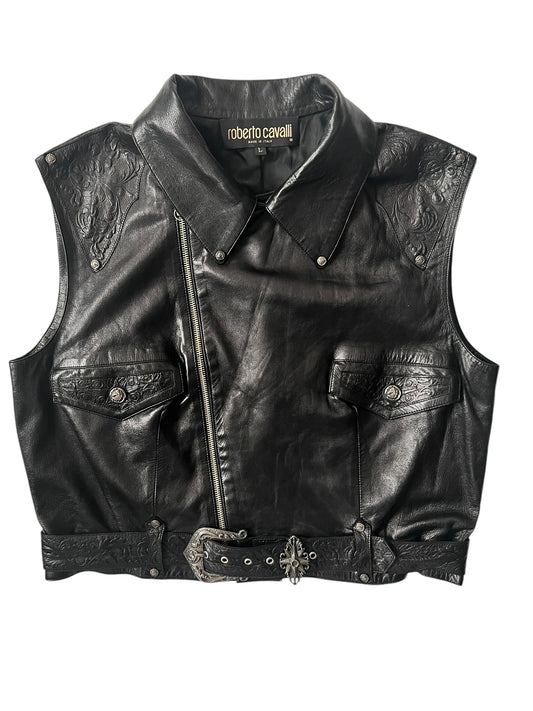 ROBERTO CAVALLI 2000s Embossed Black Leather Biker Vest (L)