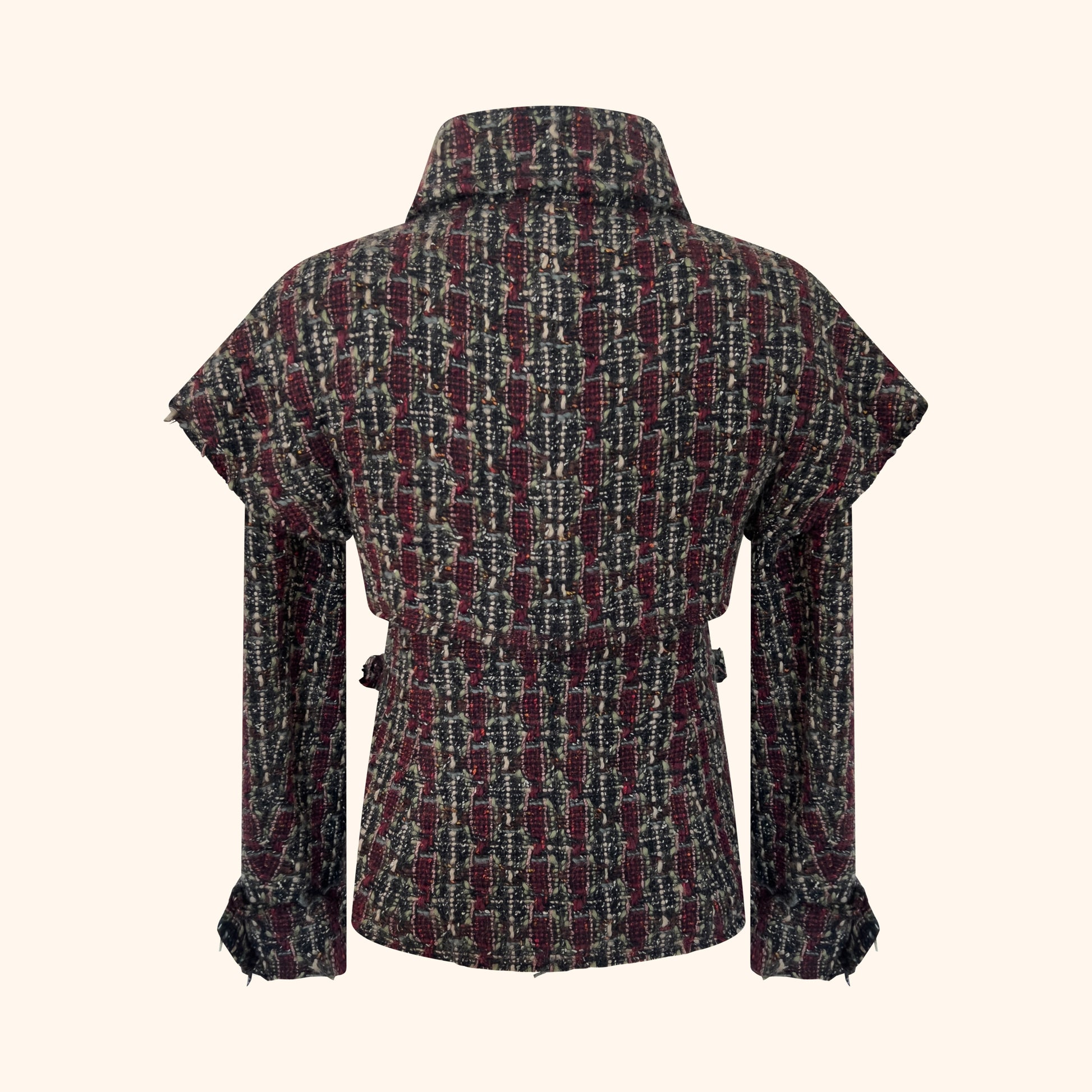 Wool tweed in tones of burgundy, green, black and ivory, woven with textured yarns for depth and dimension.