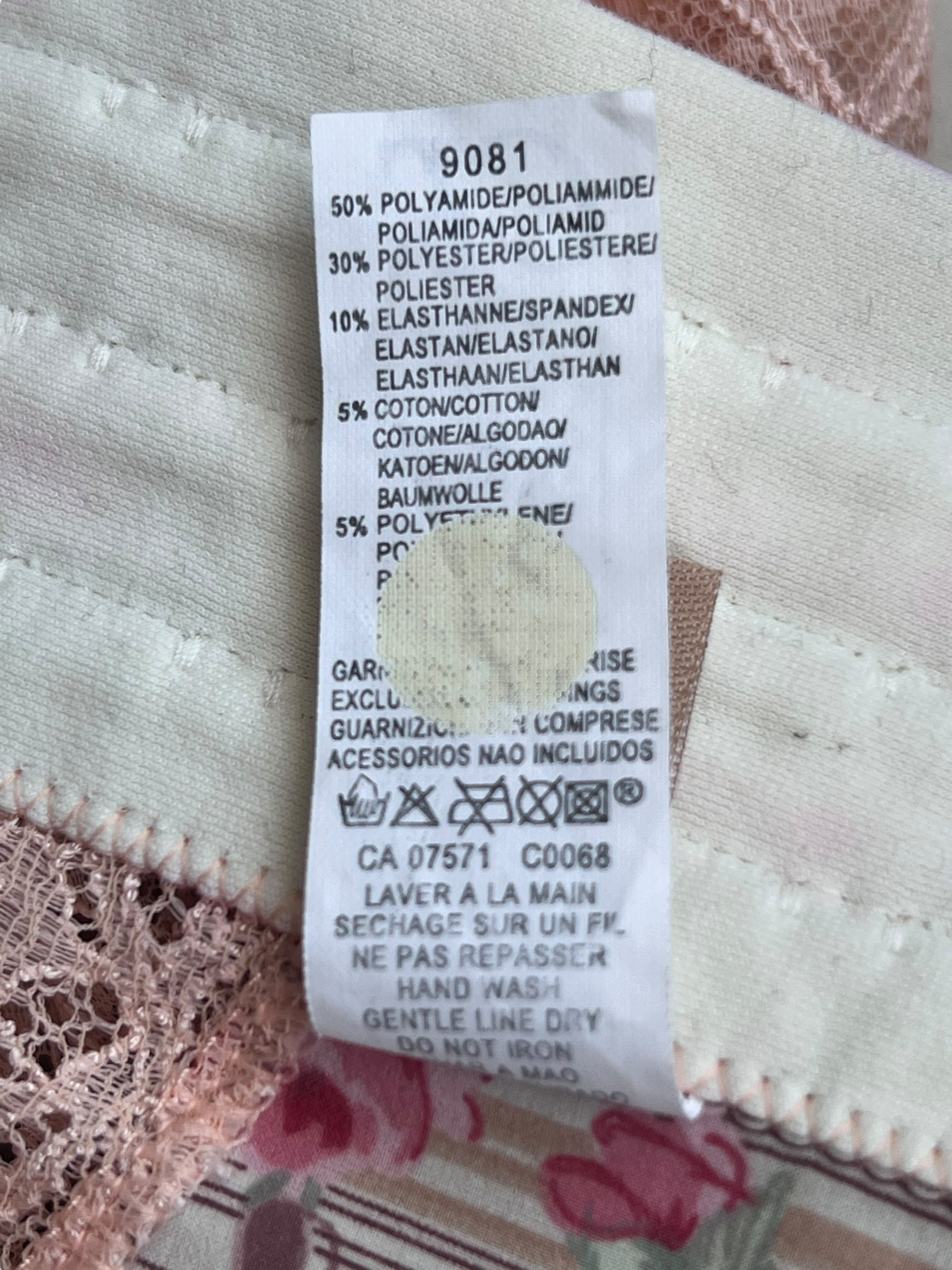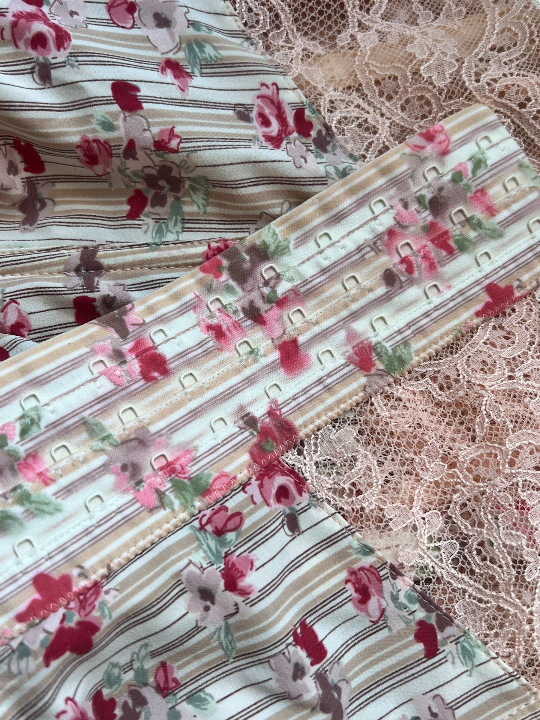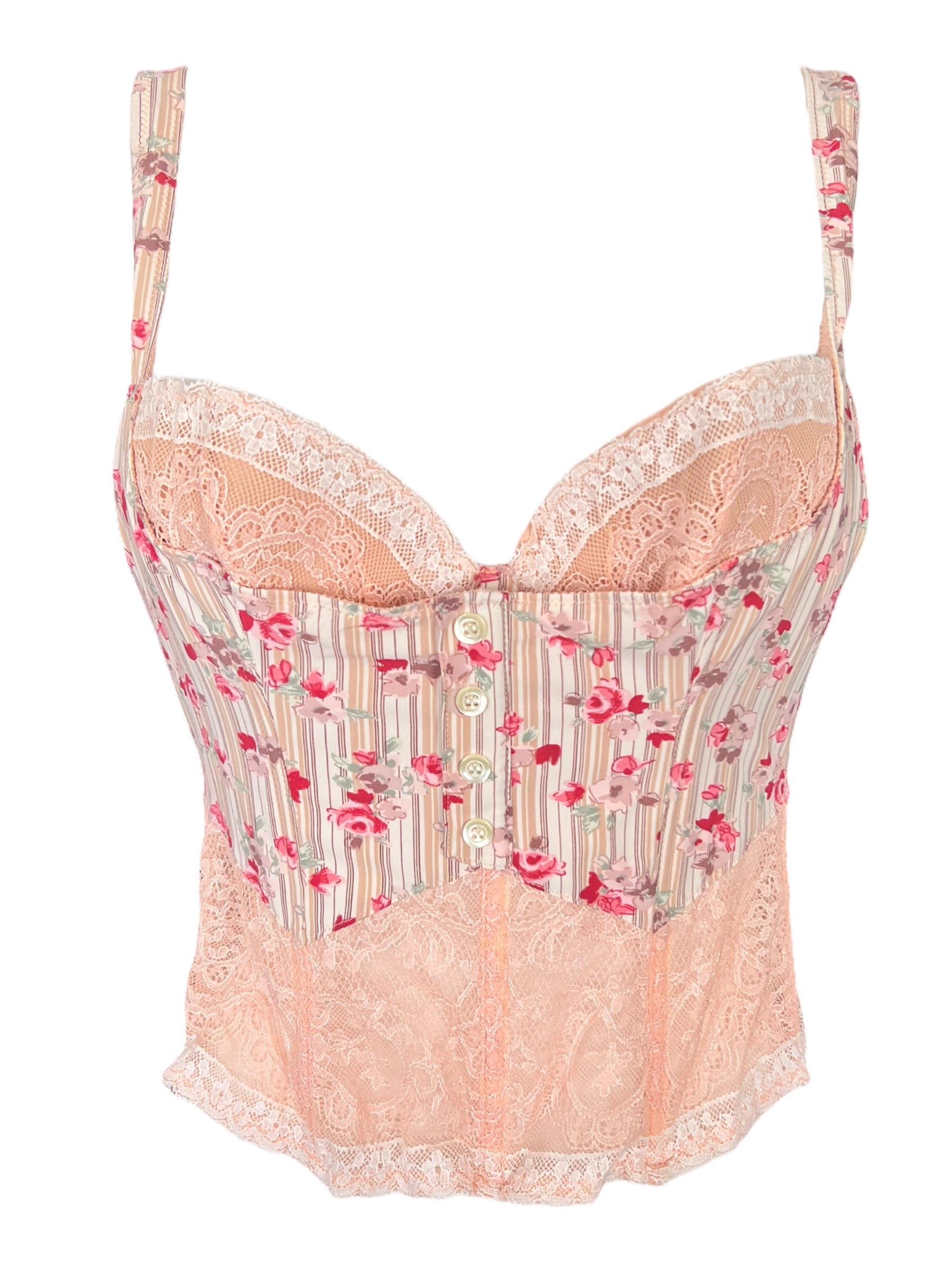 Delicate corset top crafted from striped floral satin and soft pink lace. Structured cups with lace overlay, front button closure and sheer lace panels at the hem.