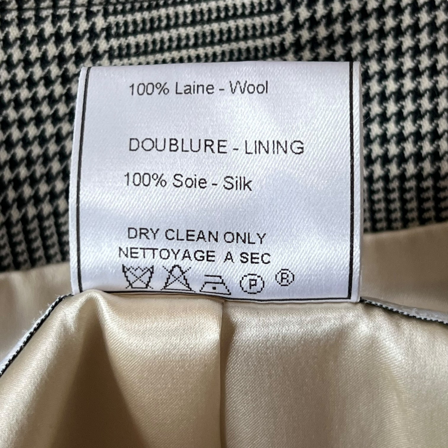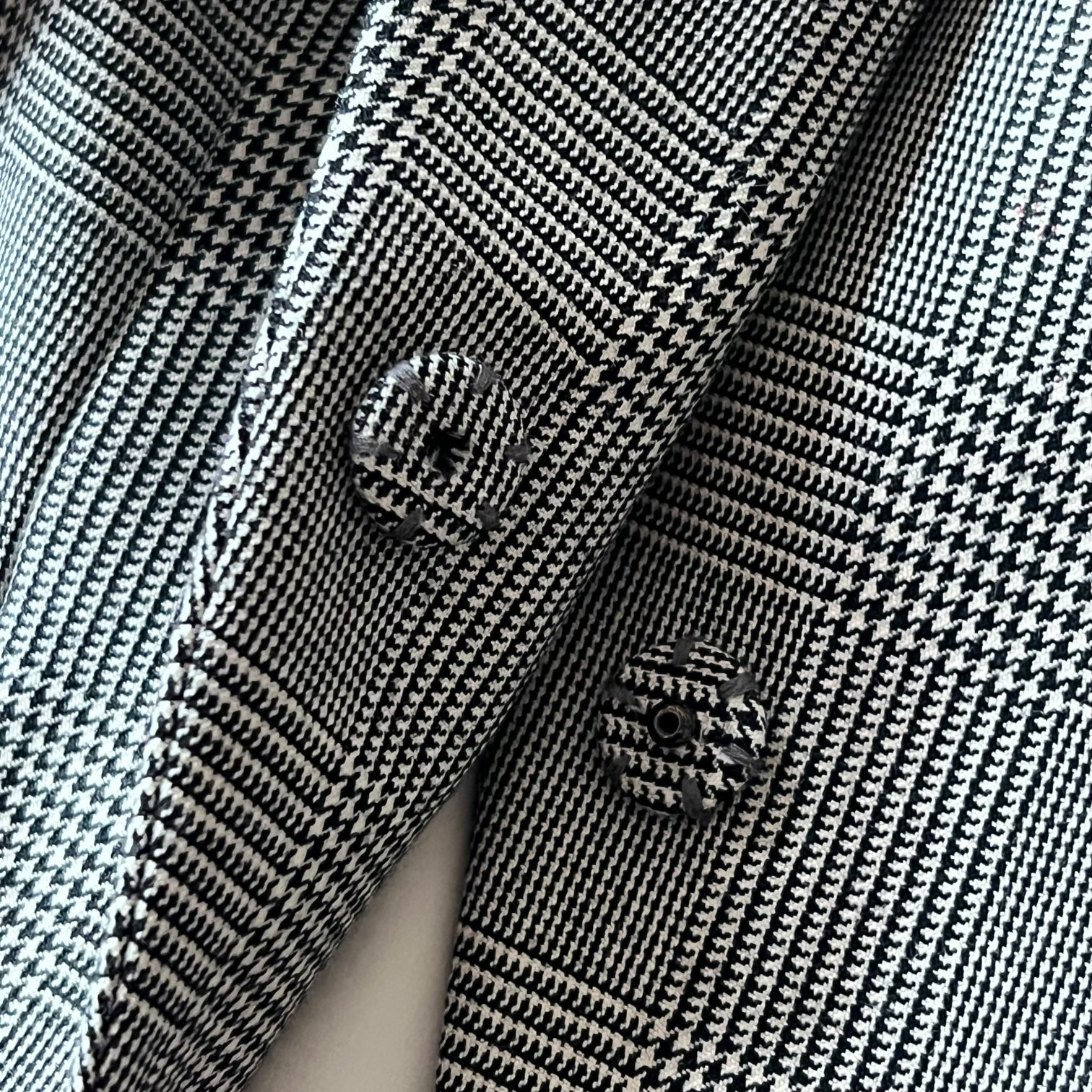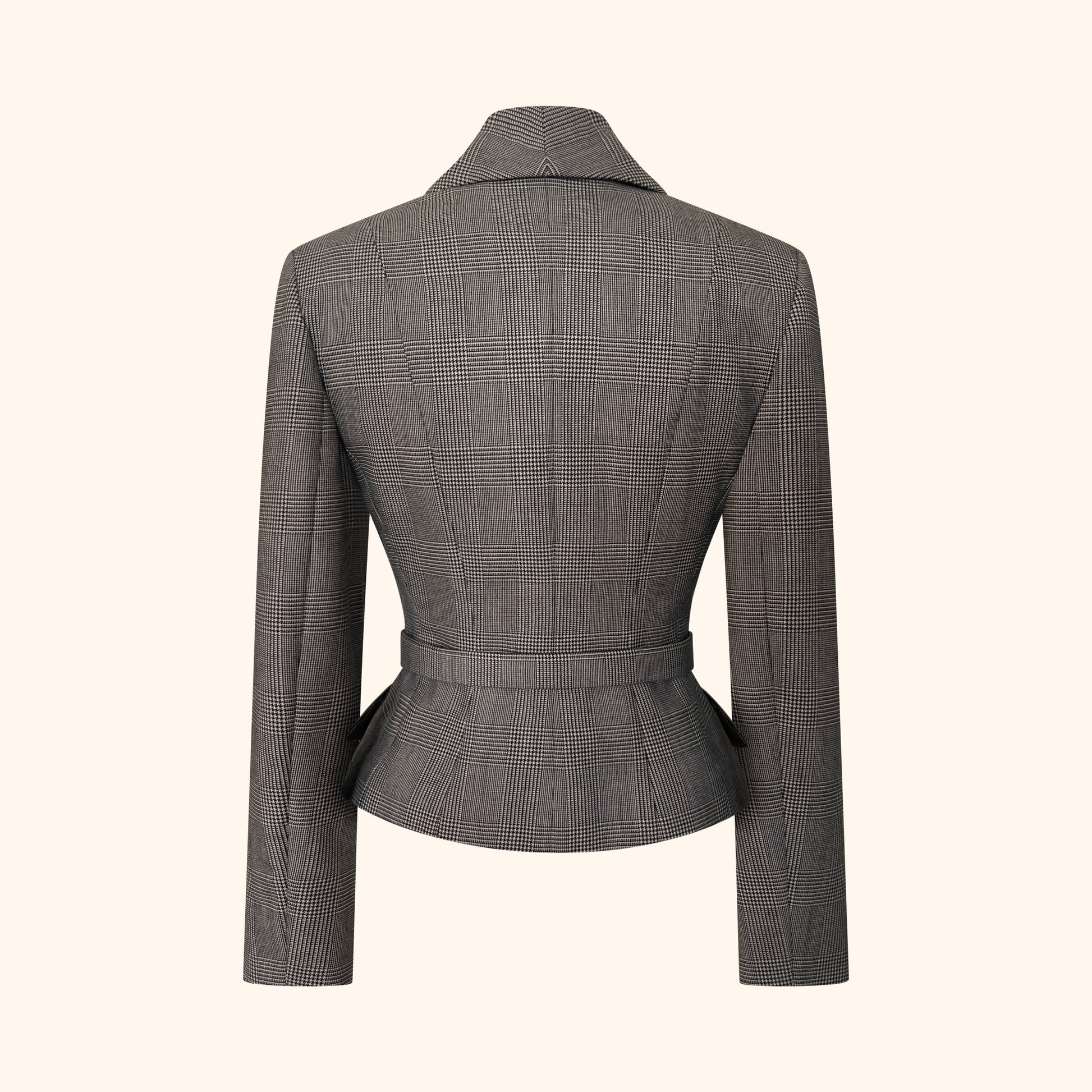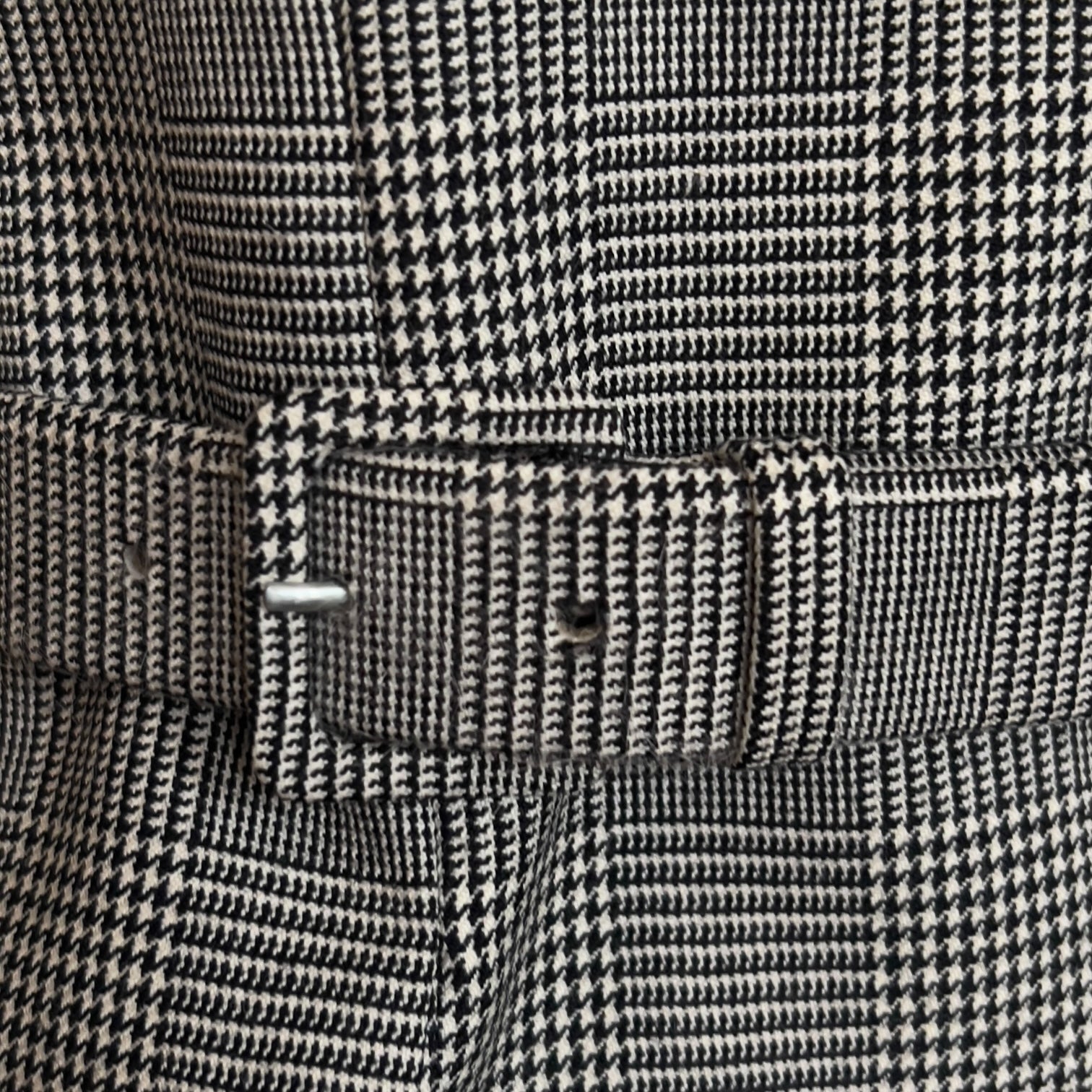 Wool Prince of Wales check in black and ivory with a structured silhouette and integrated belt at the waist.