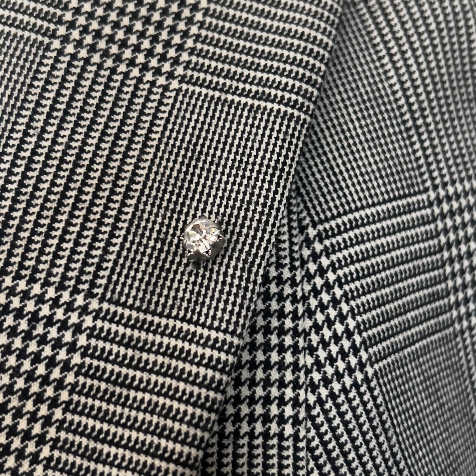 Single crystal-set button at the chest, additional fabric-covered buttons at the belt and cuffs.