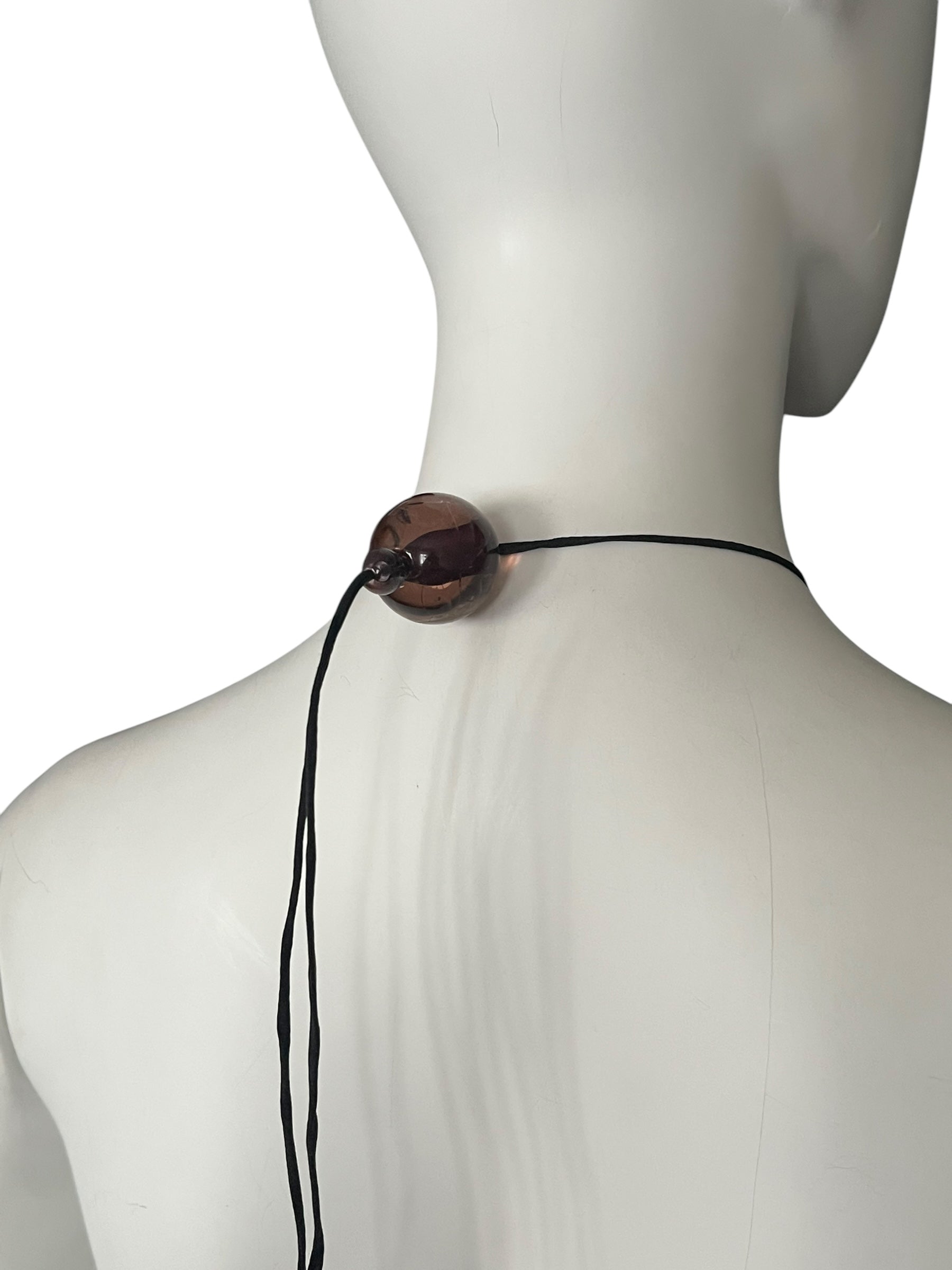 Crafted in flowing black silk, it features a halter neckline with a delicate tie detail adorned with a sculptural bead.