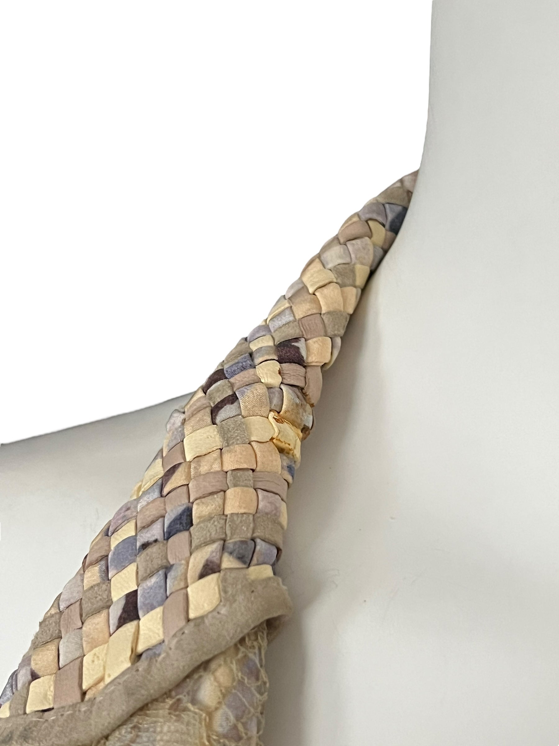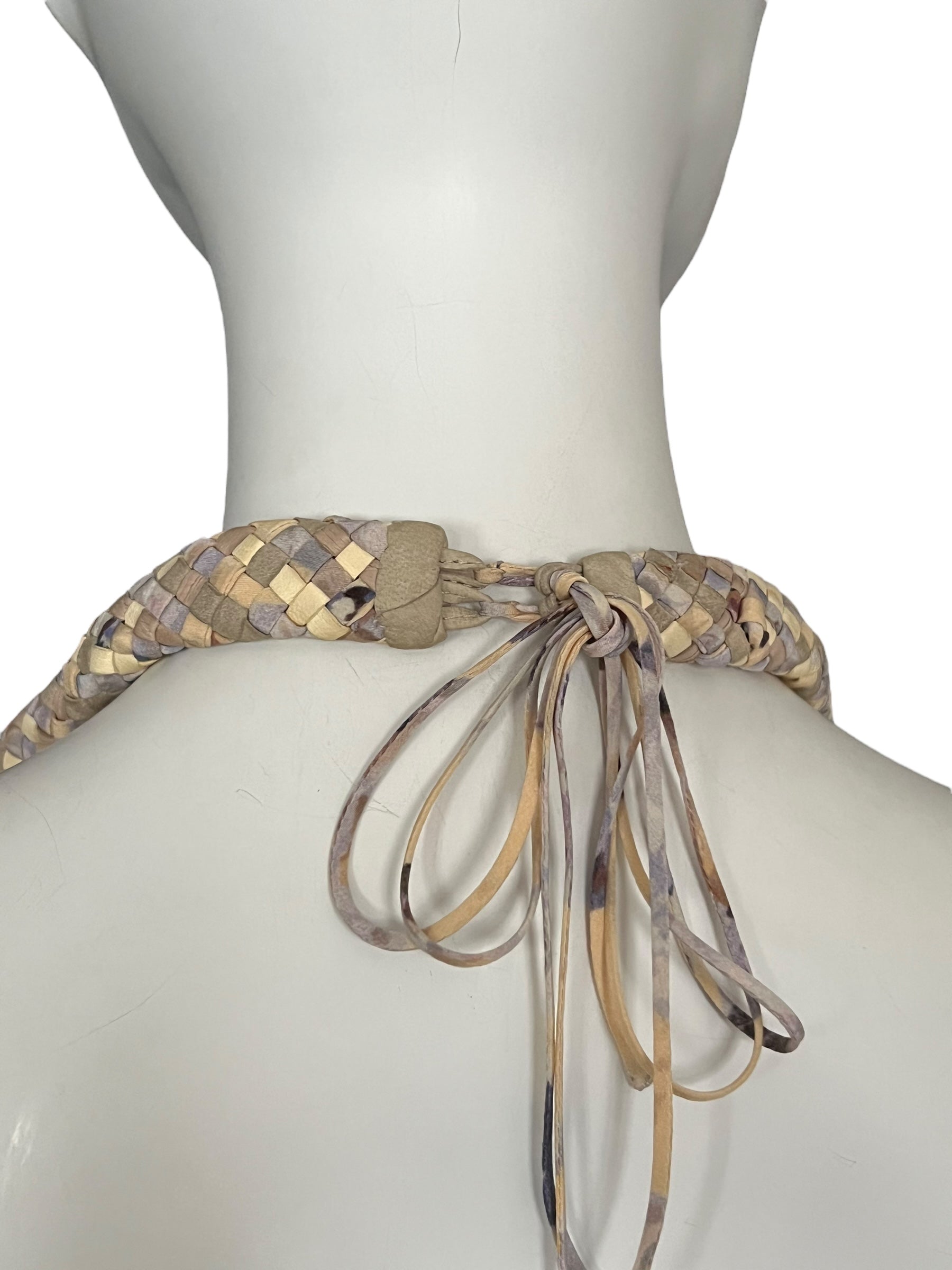 The draped halterneck design ties elegantly at the back and is adorned with woven fabric detailing for a unique textured finish.