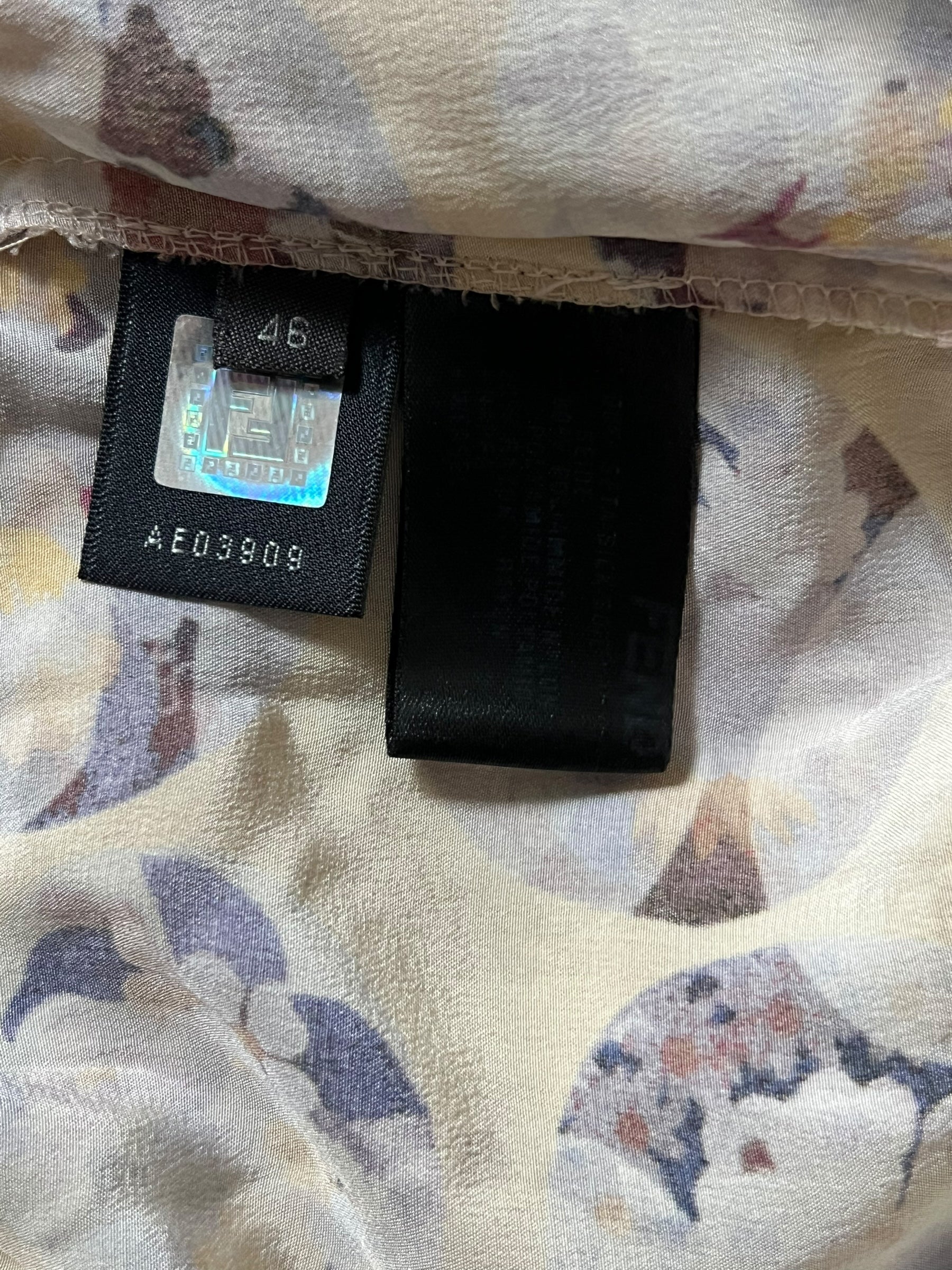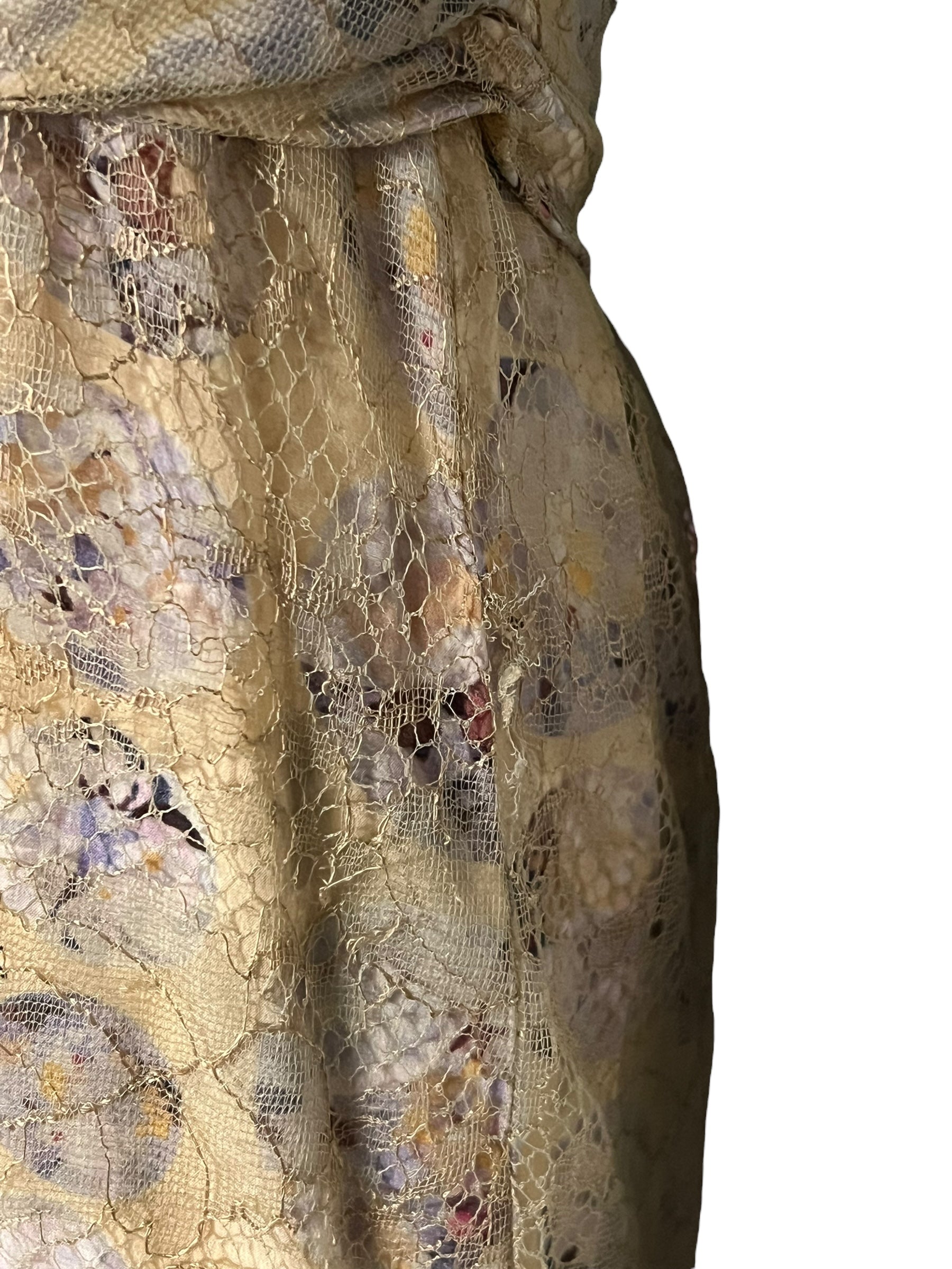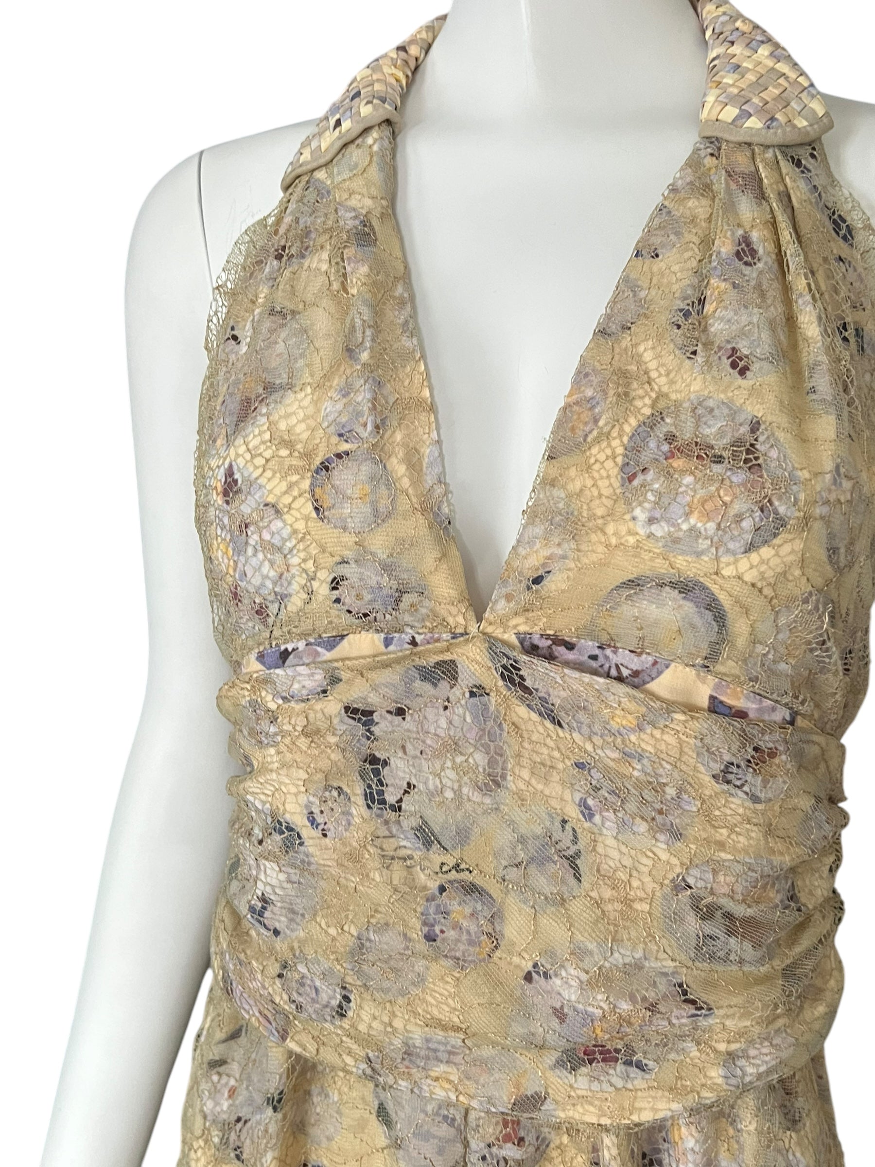 An exquisite Fendi halterneck maxi dress featuring delicate floral lace overlay in a soft beige hue, accented with subtle pastel tones.