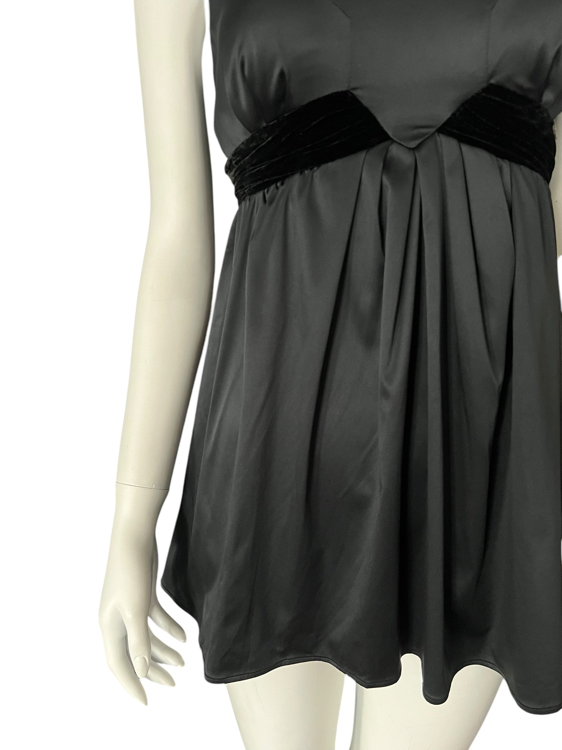 Crafted from a silky black fabric, it features a fitted empire waist accented with luxurious black velvet bands and wide velvet straps.