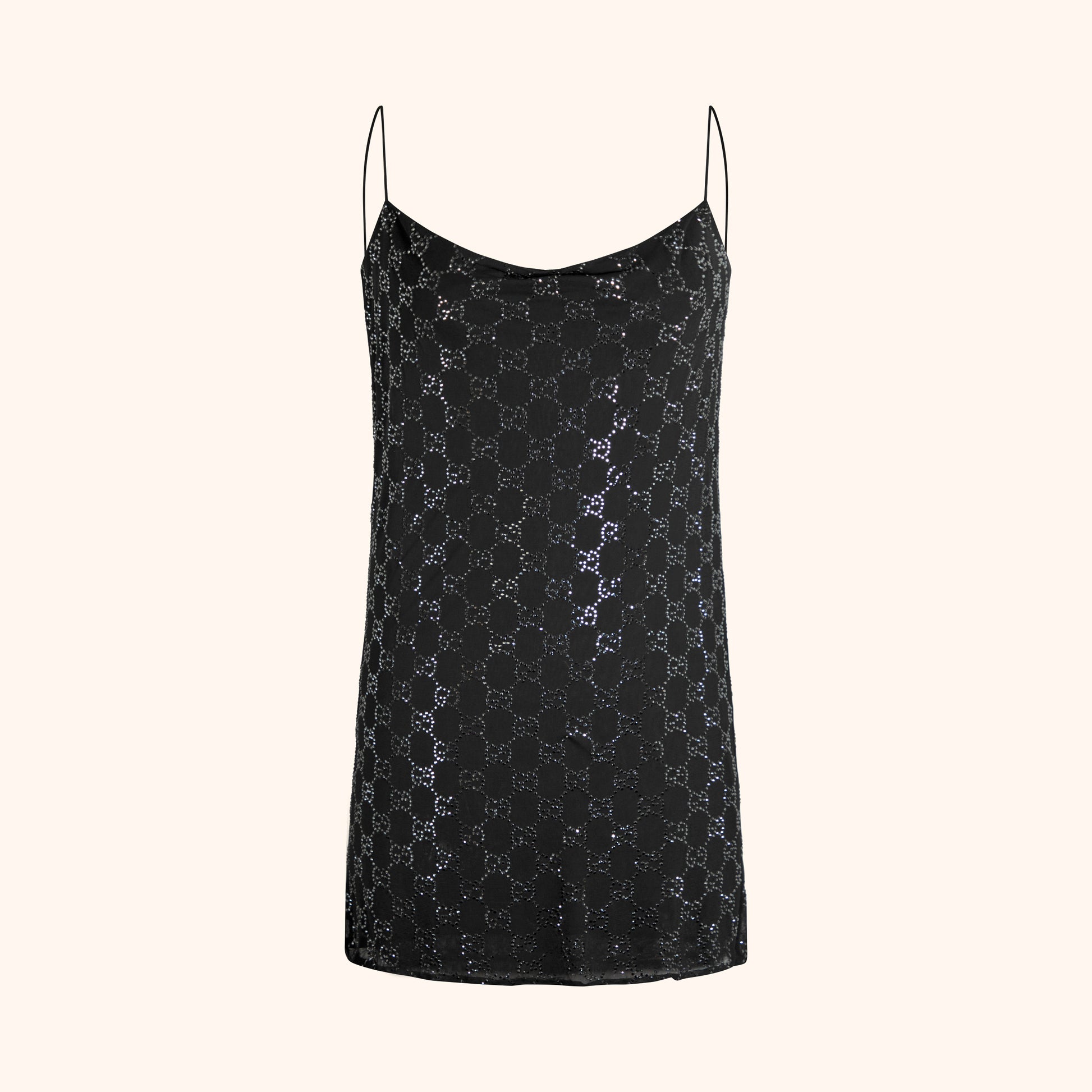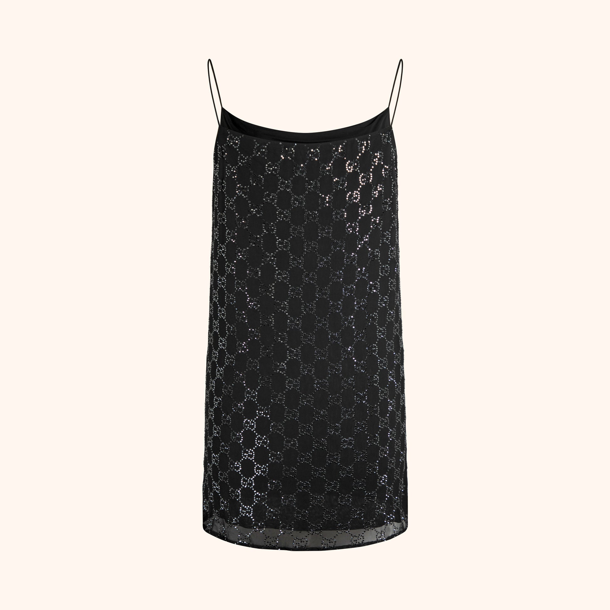 Double-layered mini dress featuring an inner black silk slip and a sheer chiffon overlay fully encrusted with Swarovski rhinestones in Gucci’s iconic GG monogram.