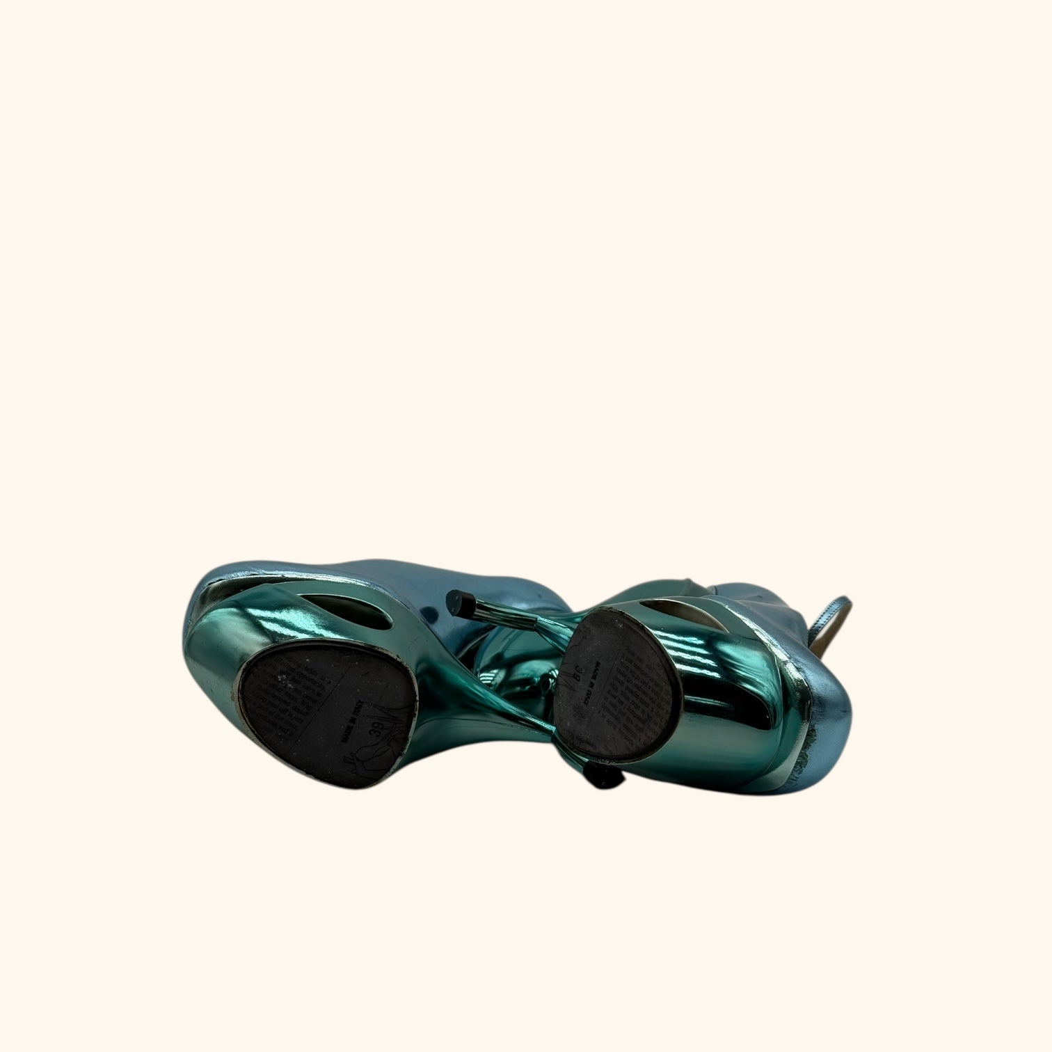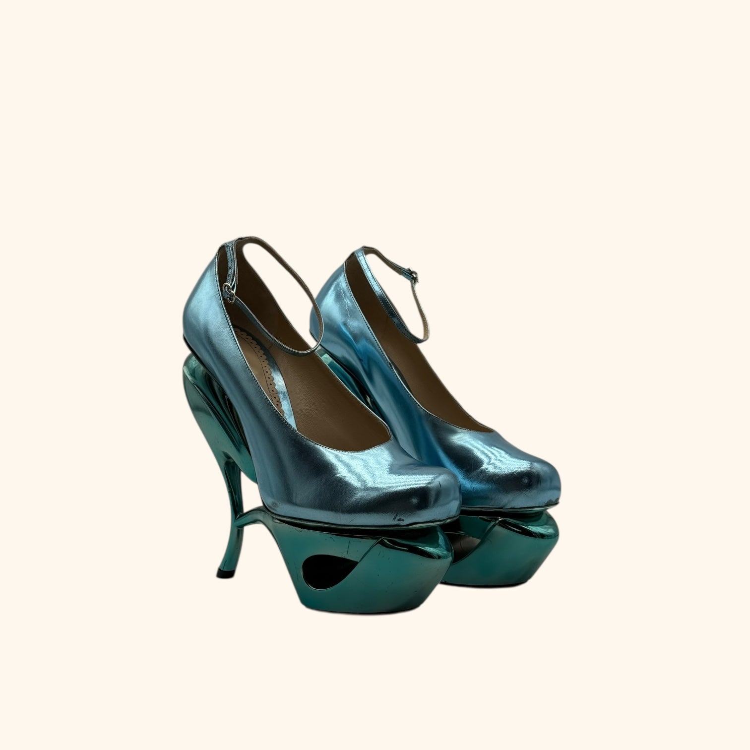 The design is defined by an architectural sculptural heel and platform, both executed in fluid, wave-like metallic forms that reflect Galliano’s avant-garde approach to volume and movement.