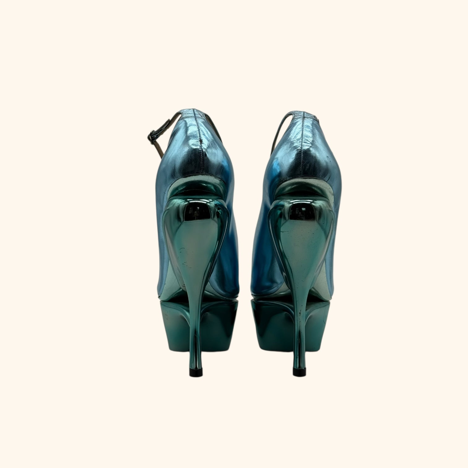 Crafted in mirrored teal leather with a lustrous finish, these platform heels feature a rounded toe and a slender ankle strap fastening.