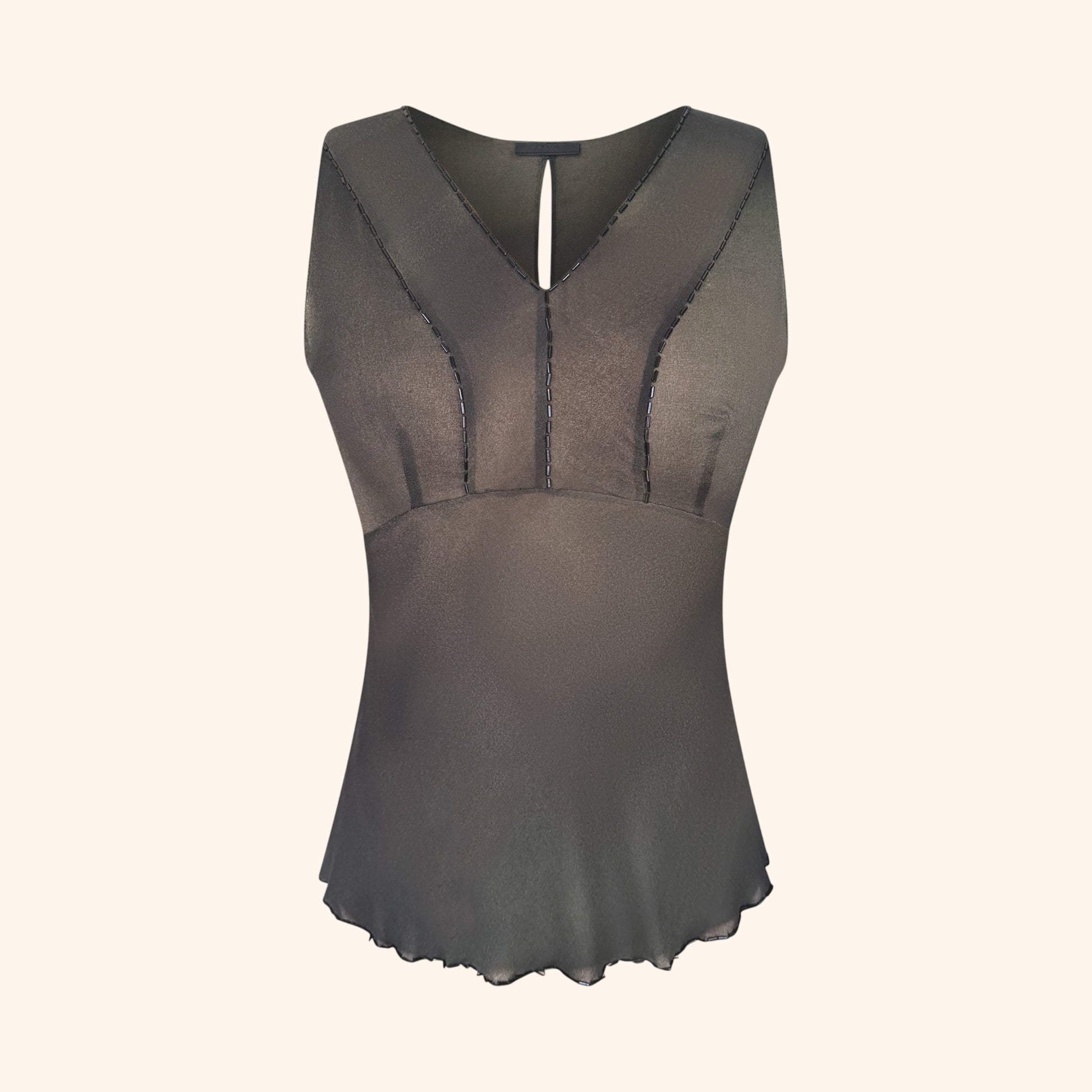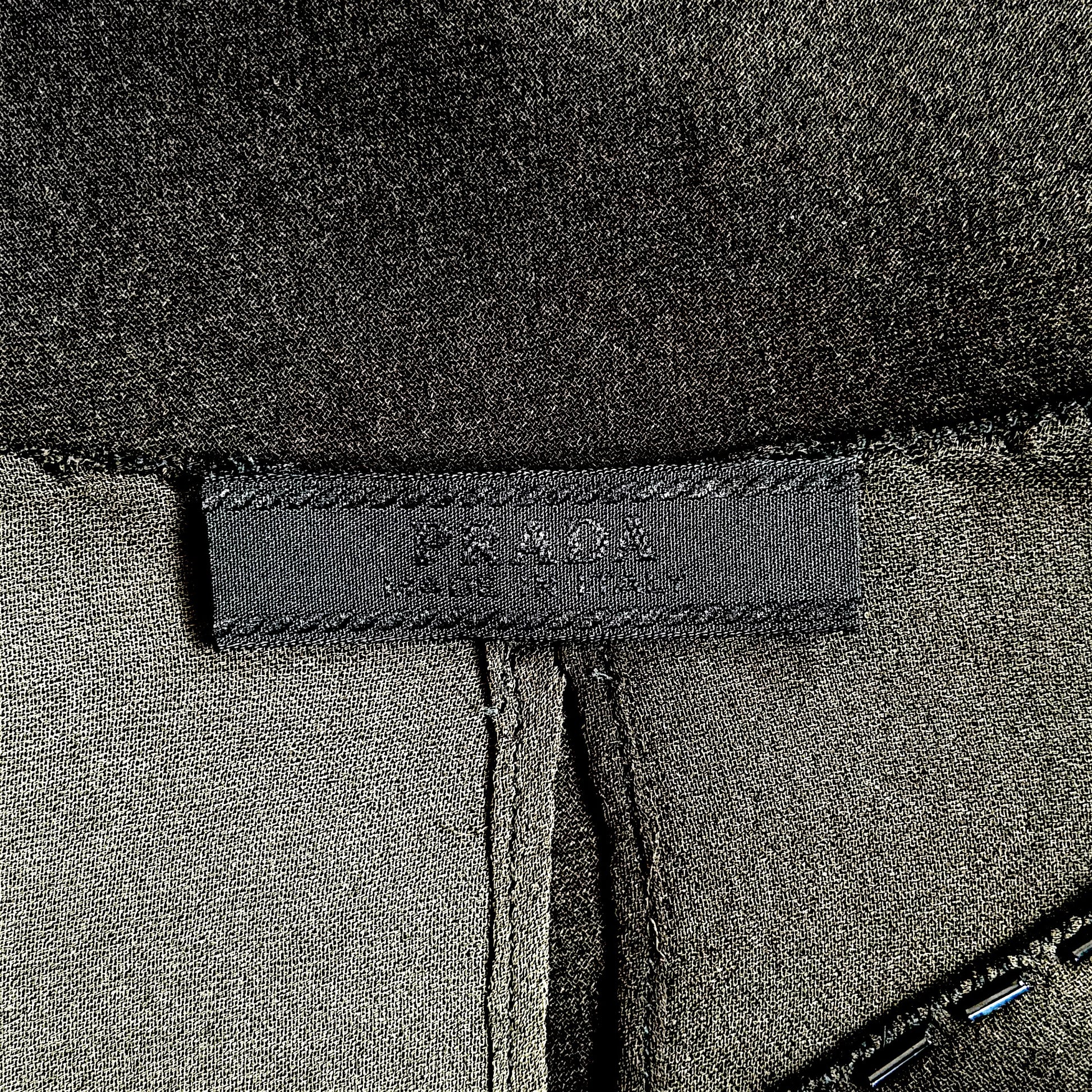 Outstanding Prada top from the Fall/Winter 1997 collection, crafted in Italy from olive-toned silk, accentuated by refined hand-applied beadwork along neckline and hem-line.