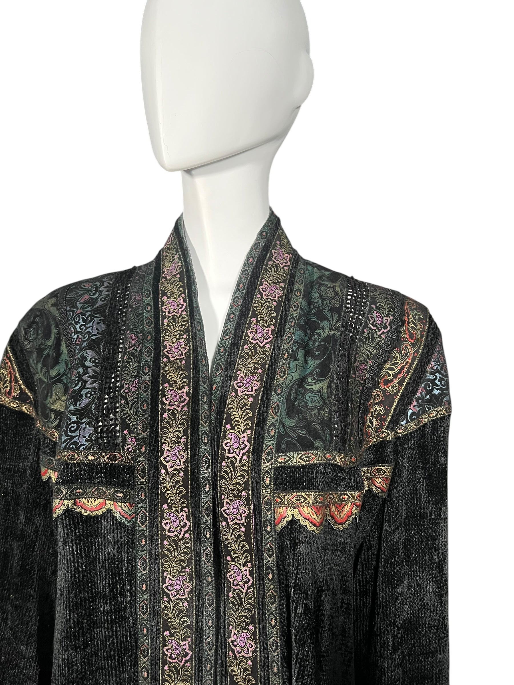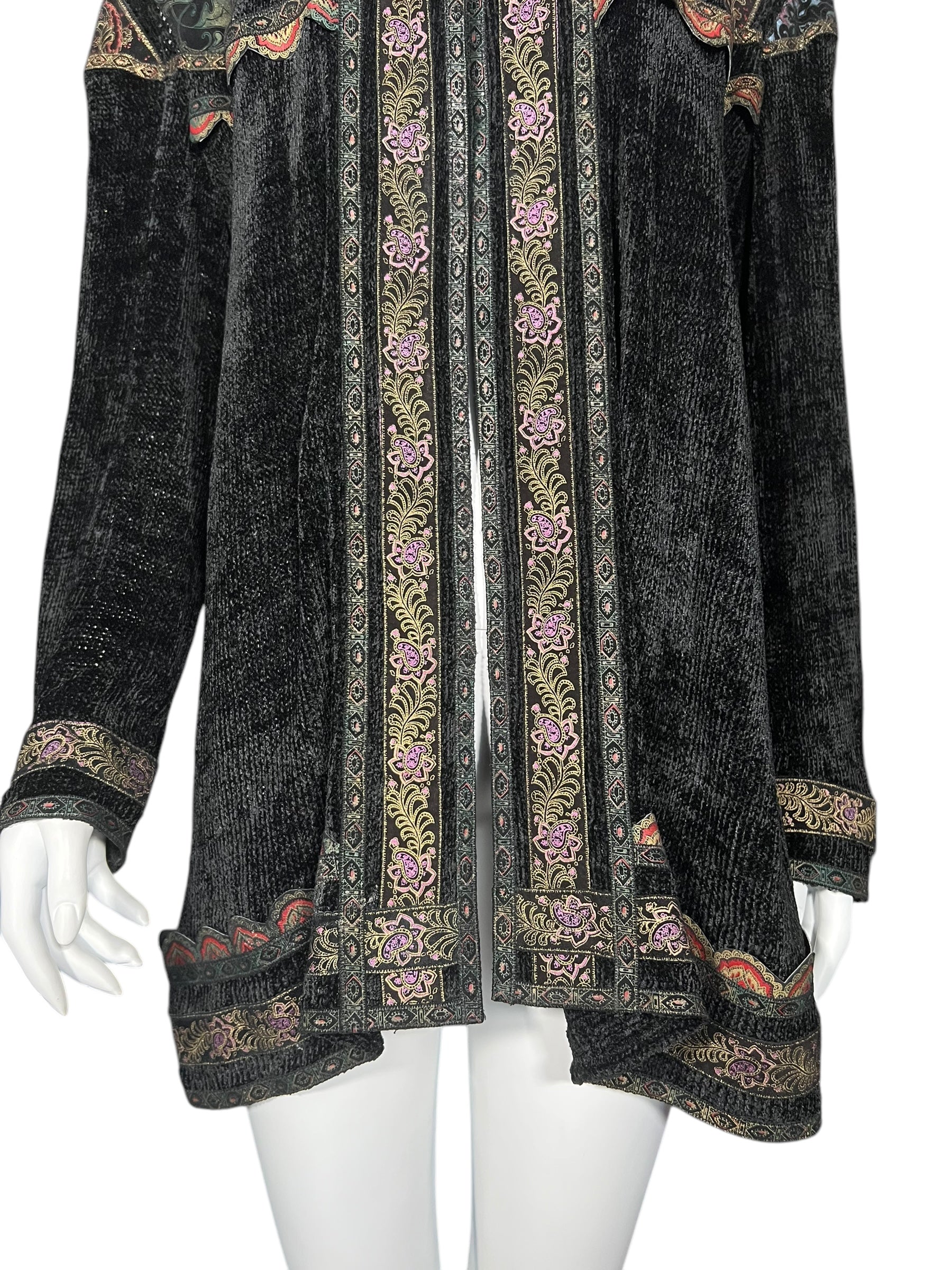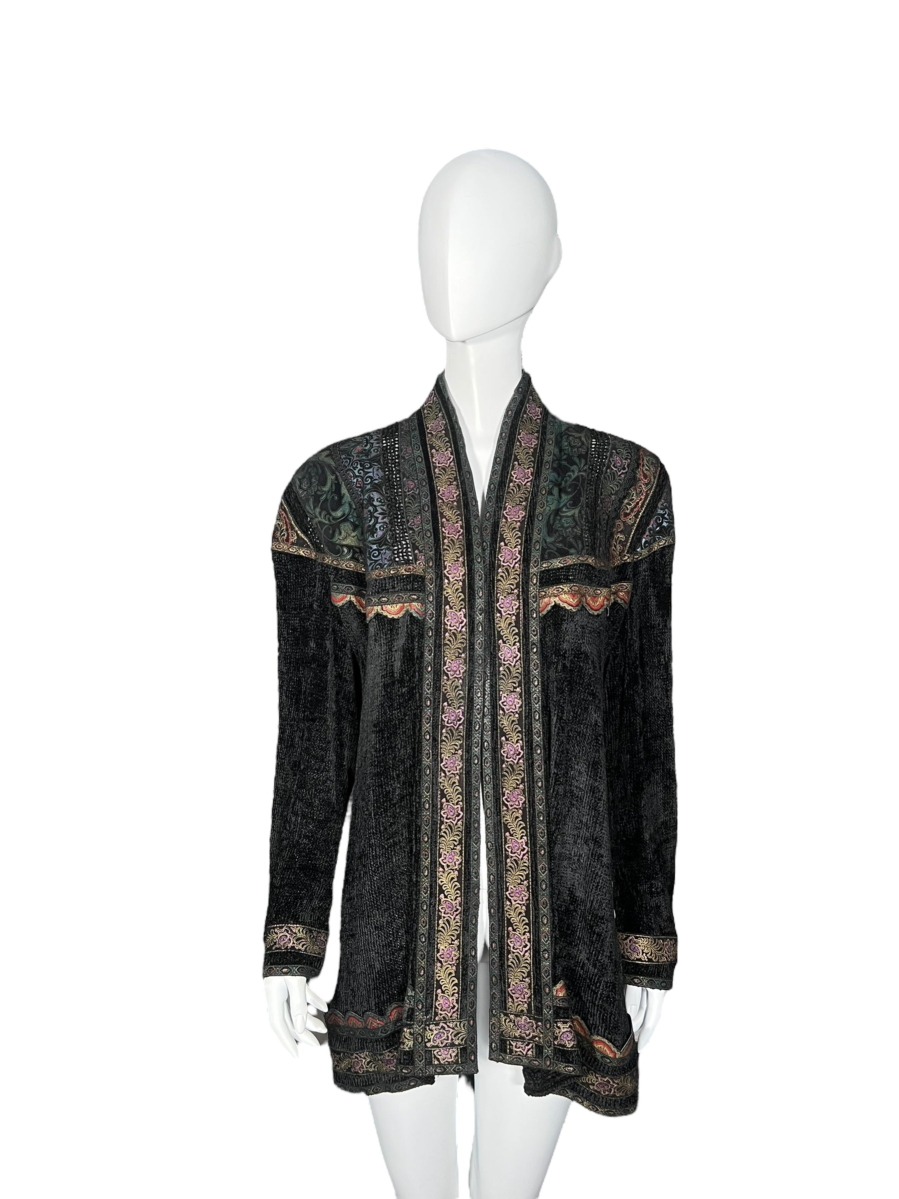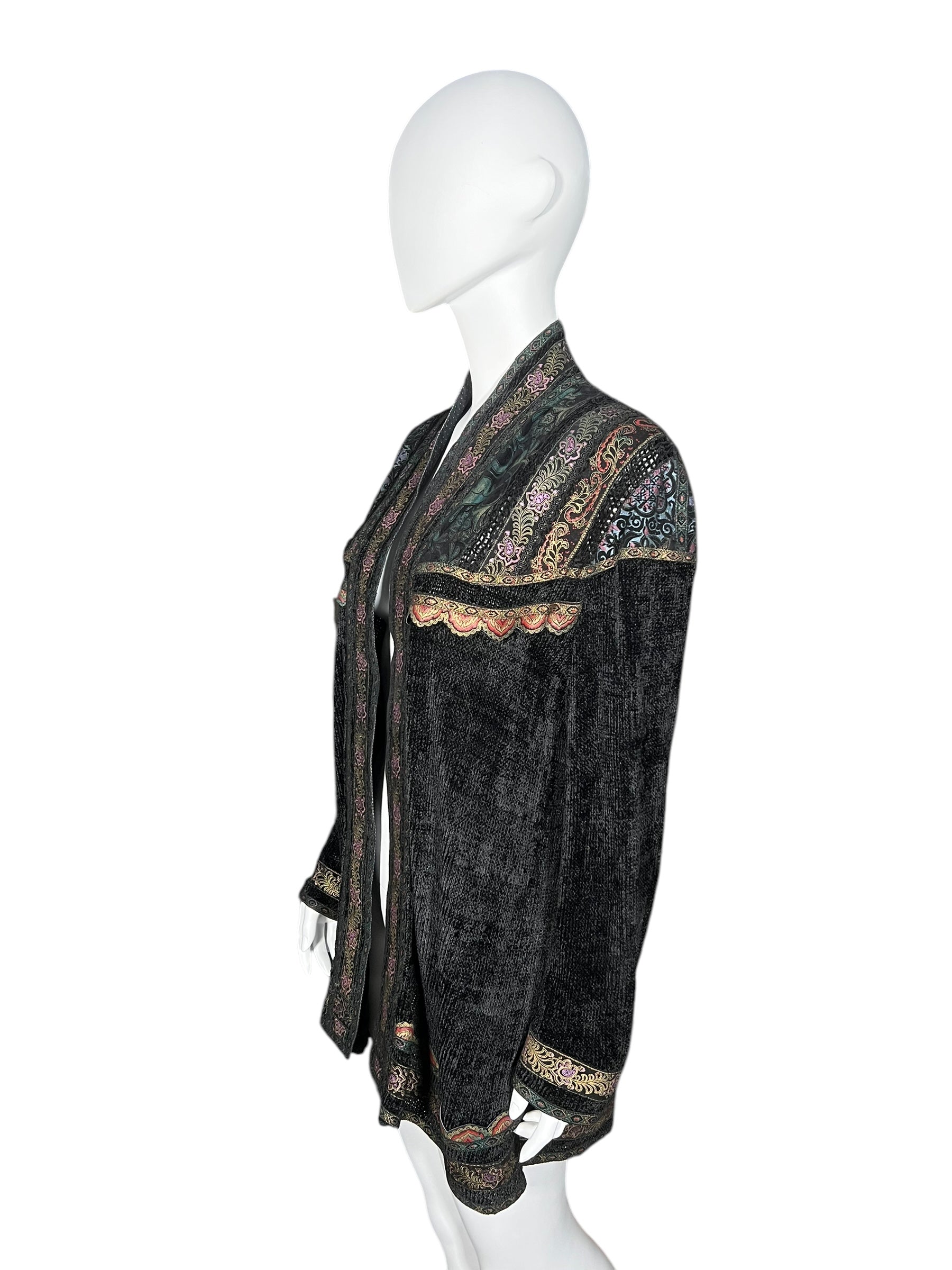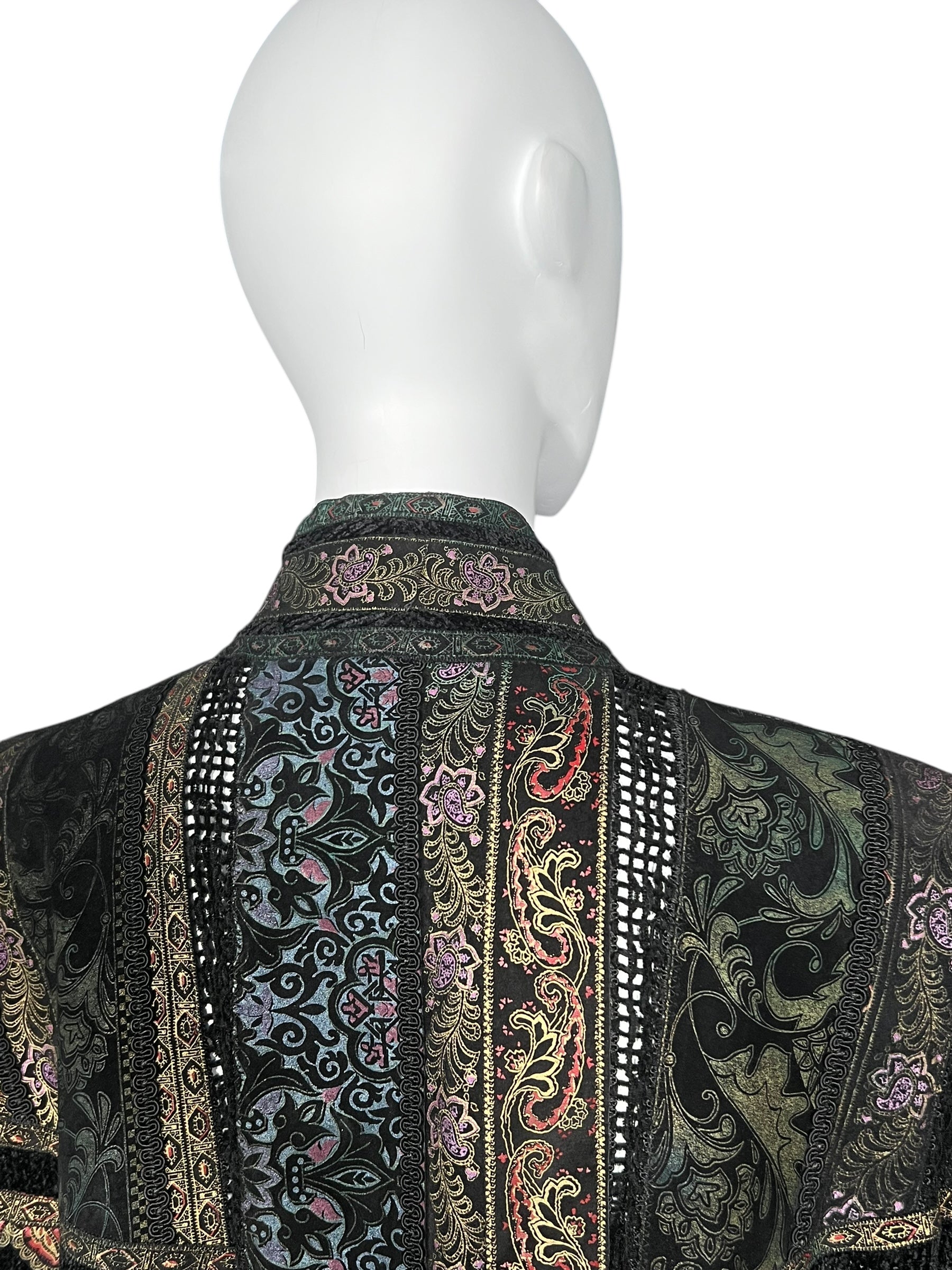 Featuring intricate multicolor paisley and floral patterns with metallic accents, this open-front piece showcases Cavalli’s signature opulent and bohemian aesthetic.