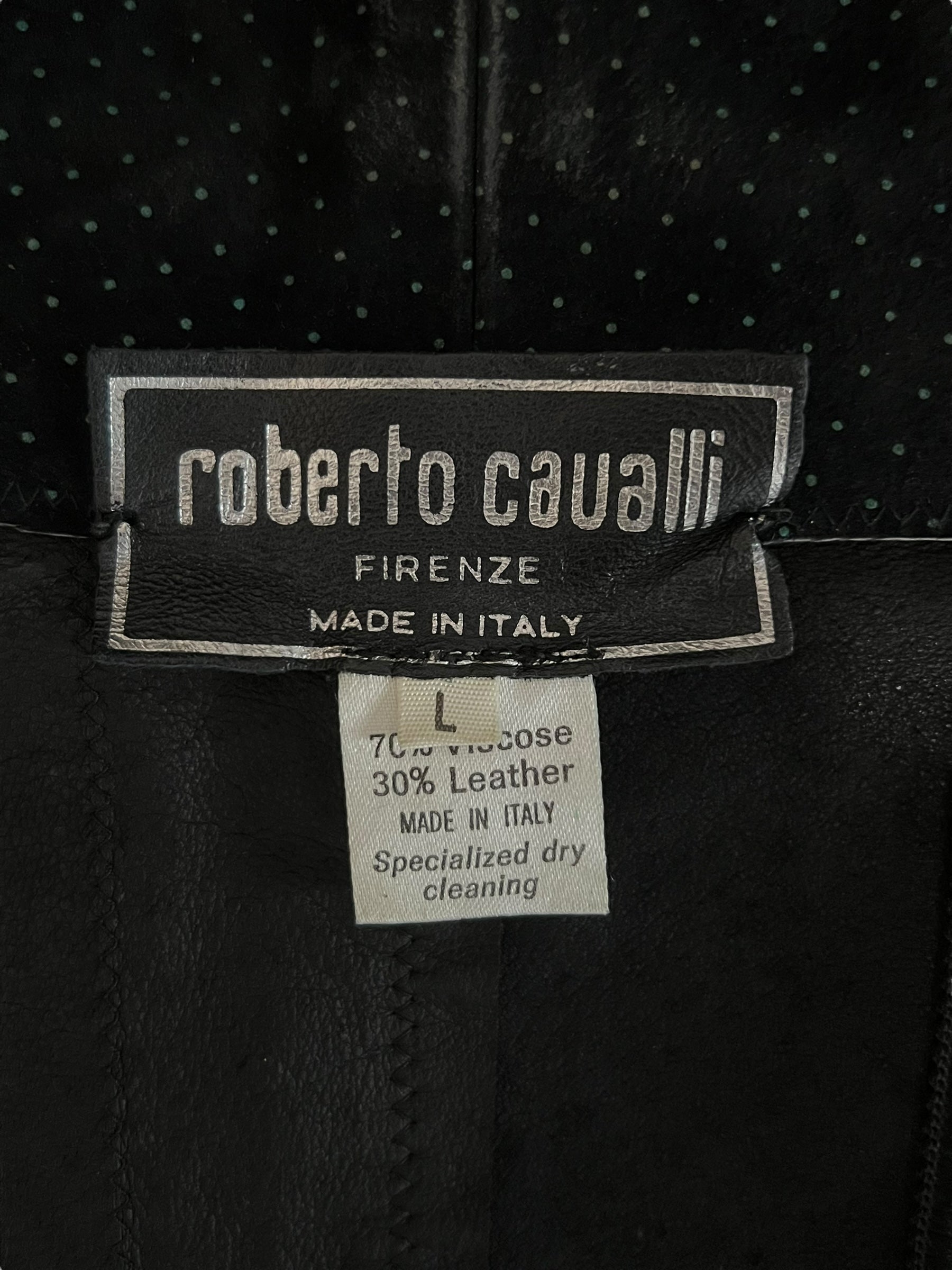A vintage 1980s Roberto Cavalli duster crafted from luxurious chenille and painted leather.