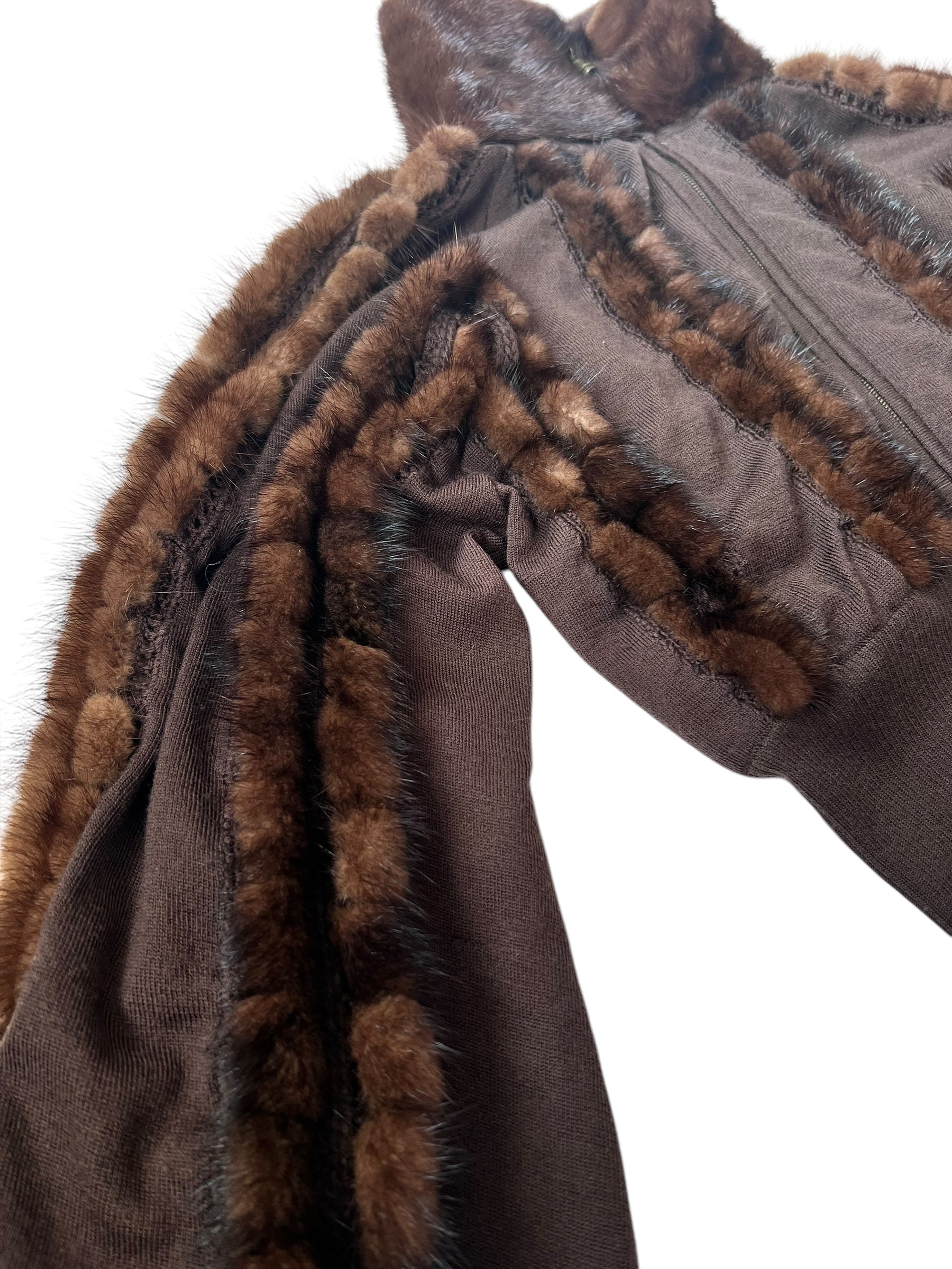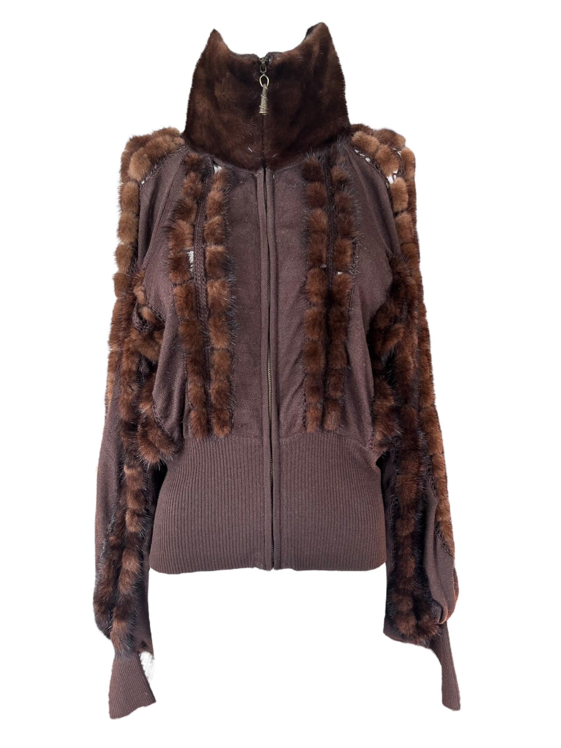 Rich chocolate mohair knit jacket with tonal vertical mink fur appliqués along the front, sleeves, shoulders and back.