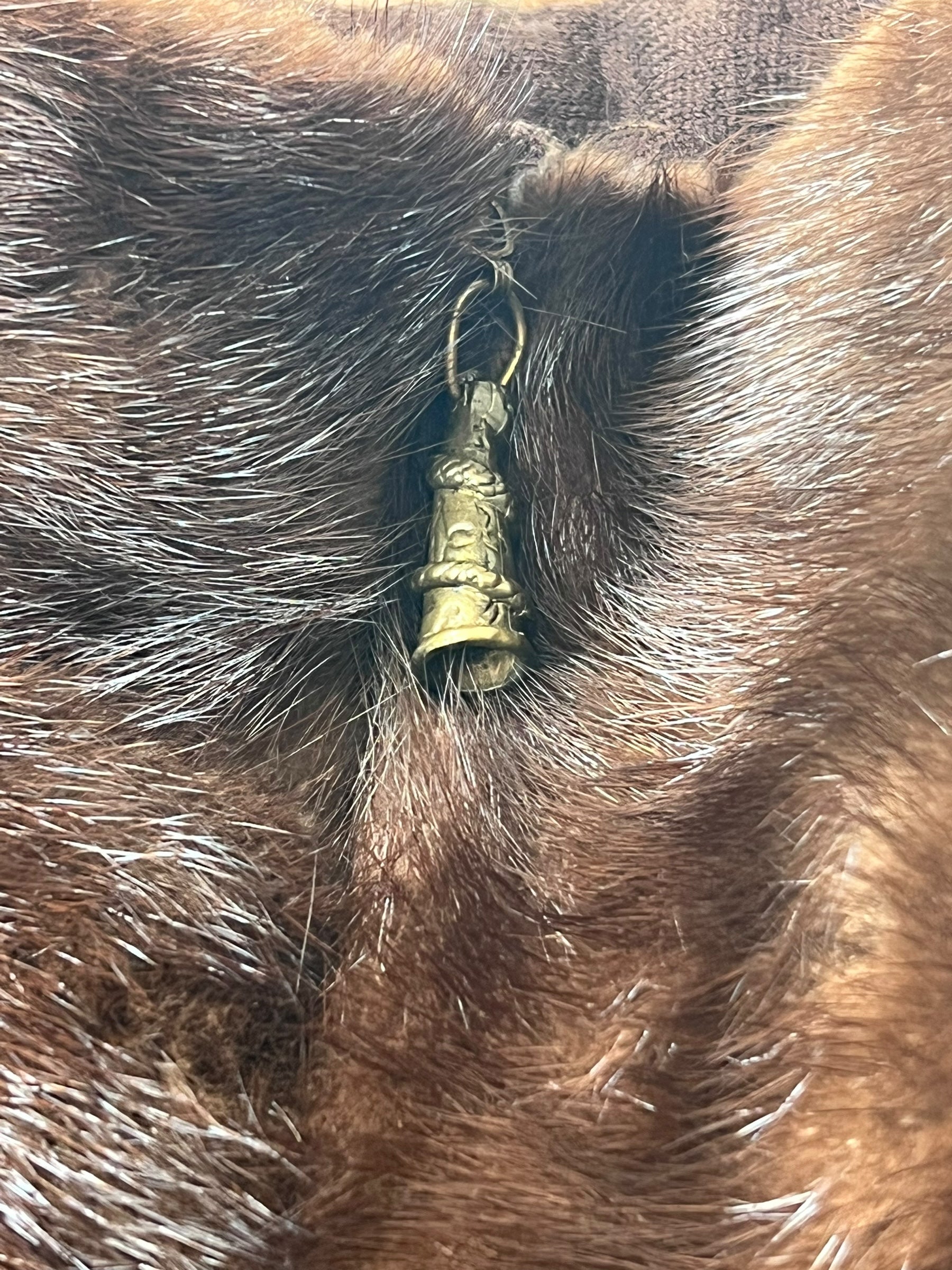 High funnel collar fully lined in glossy mink fur with a front zip closure and antique brass-tone pull charm.