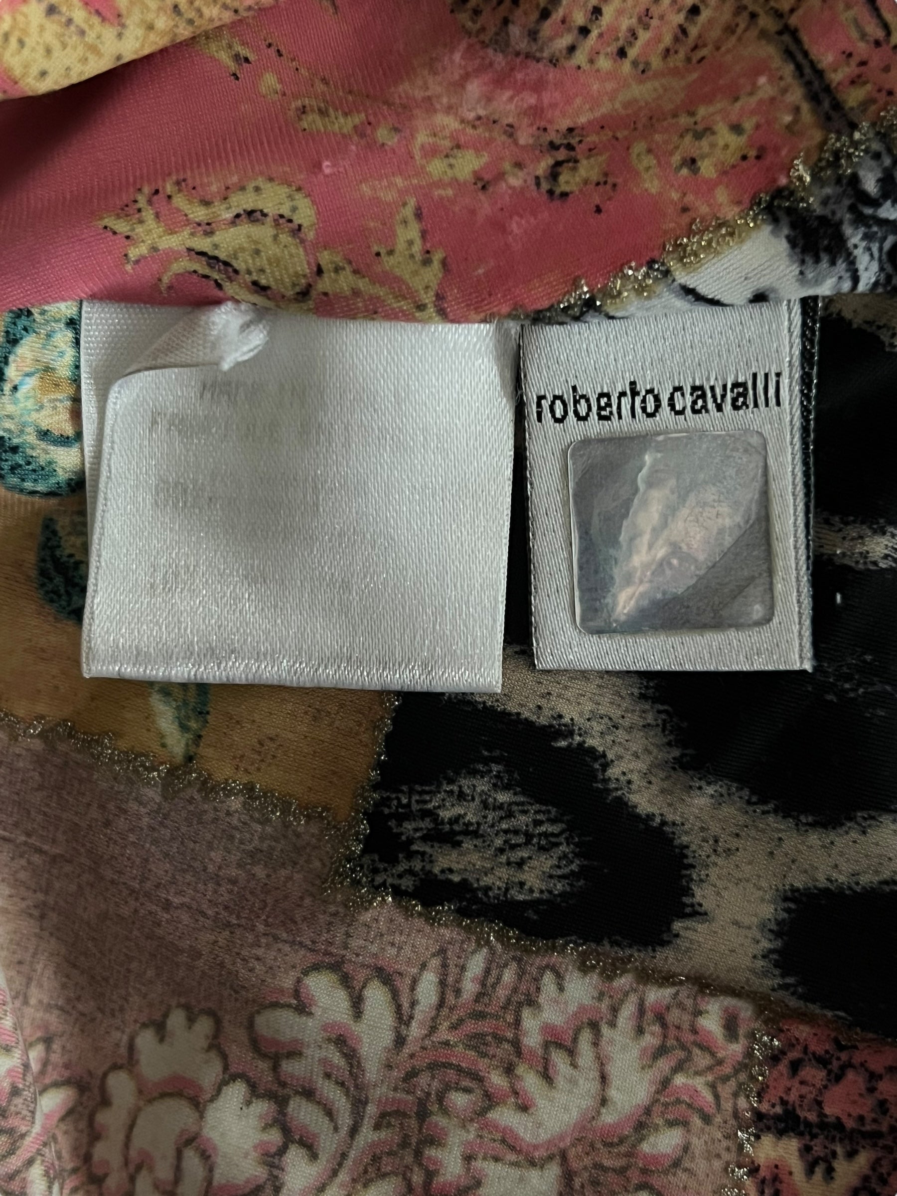 This dress embodies Cavalli's signature bold and opulent style, combining intricate florals, paisleys, animal prints, and metallic accents into a striking patchwork design.