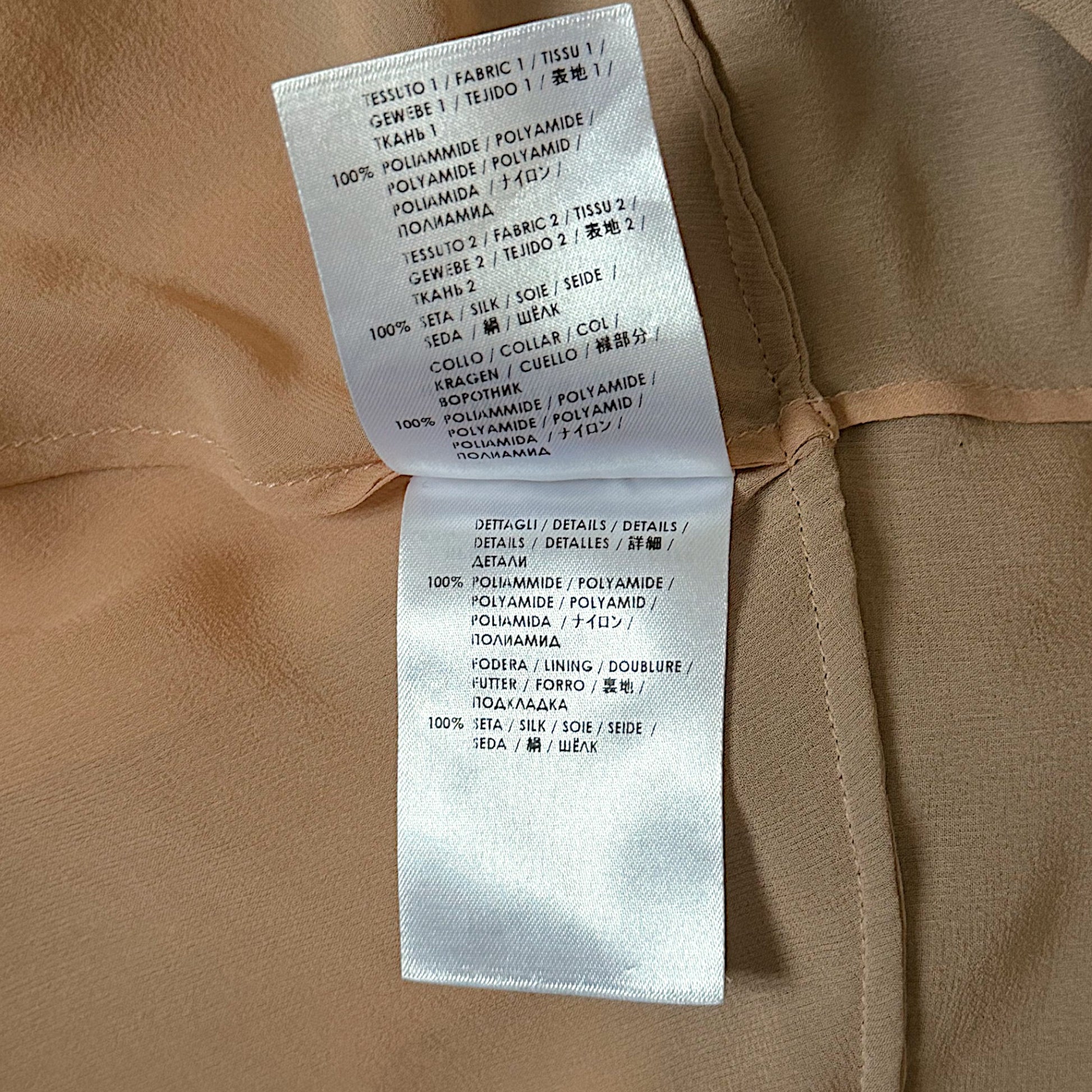 Deep V halter neckline with integrated neck strap, contrasting nude silk lining, and ornate lace appliqué panels placed along the neckline and front center seam.